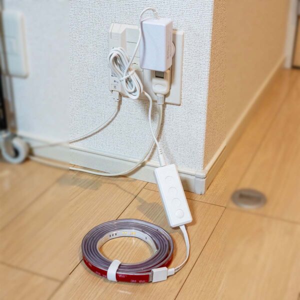 電源ケーブル、コントローラー、LEDテープライトを連結してコンセントに差すと、これだけでNanoleaf LEDテープライトは一応使えます。