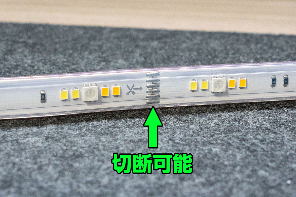「Nanoleaf LEDテープライト 拡張パック」は1 m単位で安価に売られているので、気軽に切断できます。