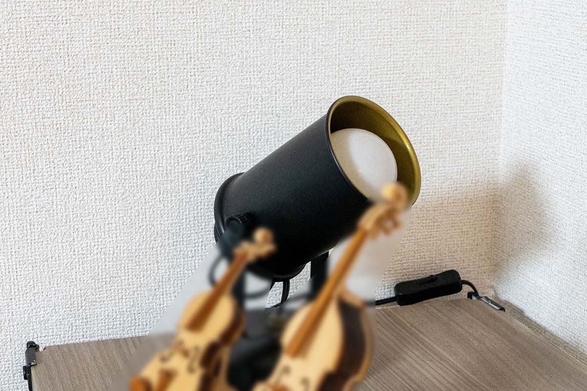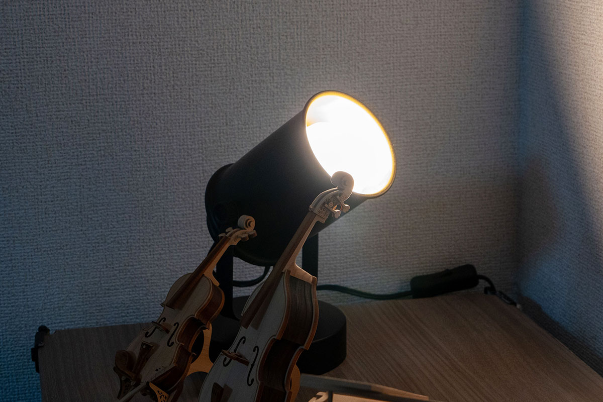 白基調のホワイトデスクや壁との相性がよく、やわらかい間接光で空間の印象がガラッと変わります。
